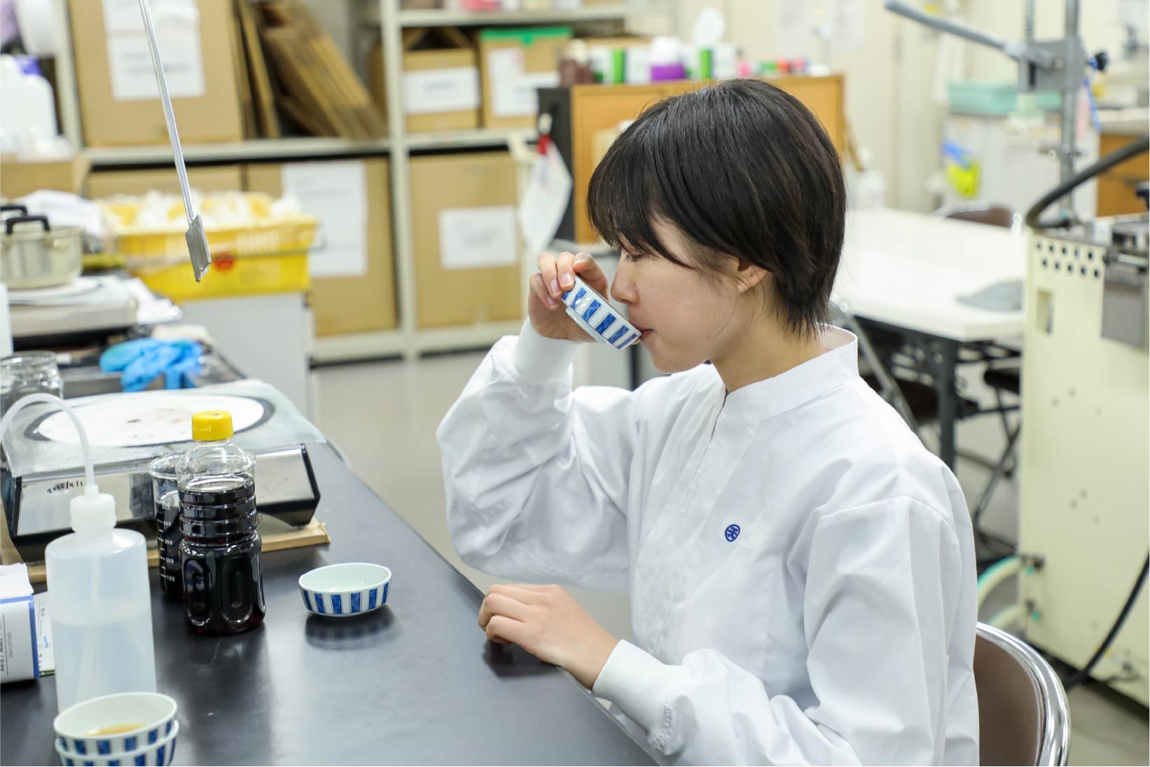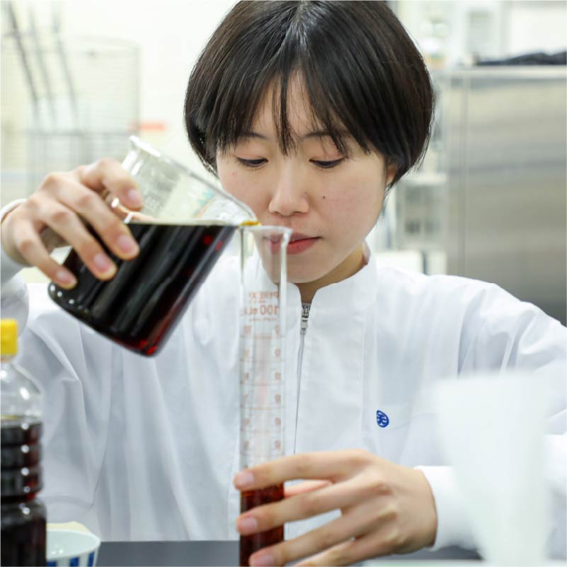 入社してから最初の6ヶ月くらいは、研修期間でした。商品について学んだり、分析室で機器の使い方を教えてもらったり。工場に入って生産設備を紹介してもらう、製造研修もありました。数ある研修プログラムの中で特に印象深いのが、ポン酢と焼肉のタレの研修です。まずは自社商品含め色々な会社の商品を飲み比べて、特徴を理解していきました。その過程で開発の仕事は、味をみて判断していくのだと知りました。それから先輩に協力してもらいながら、見本となる商品に近い味を試作。その過程で原材料の種類や、粘度のつけ方といった仕組みなど学んでいきました。最初の試作は美味しくできなかったのですが(苦笑)、それも含めていい学びになったなと思います。